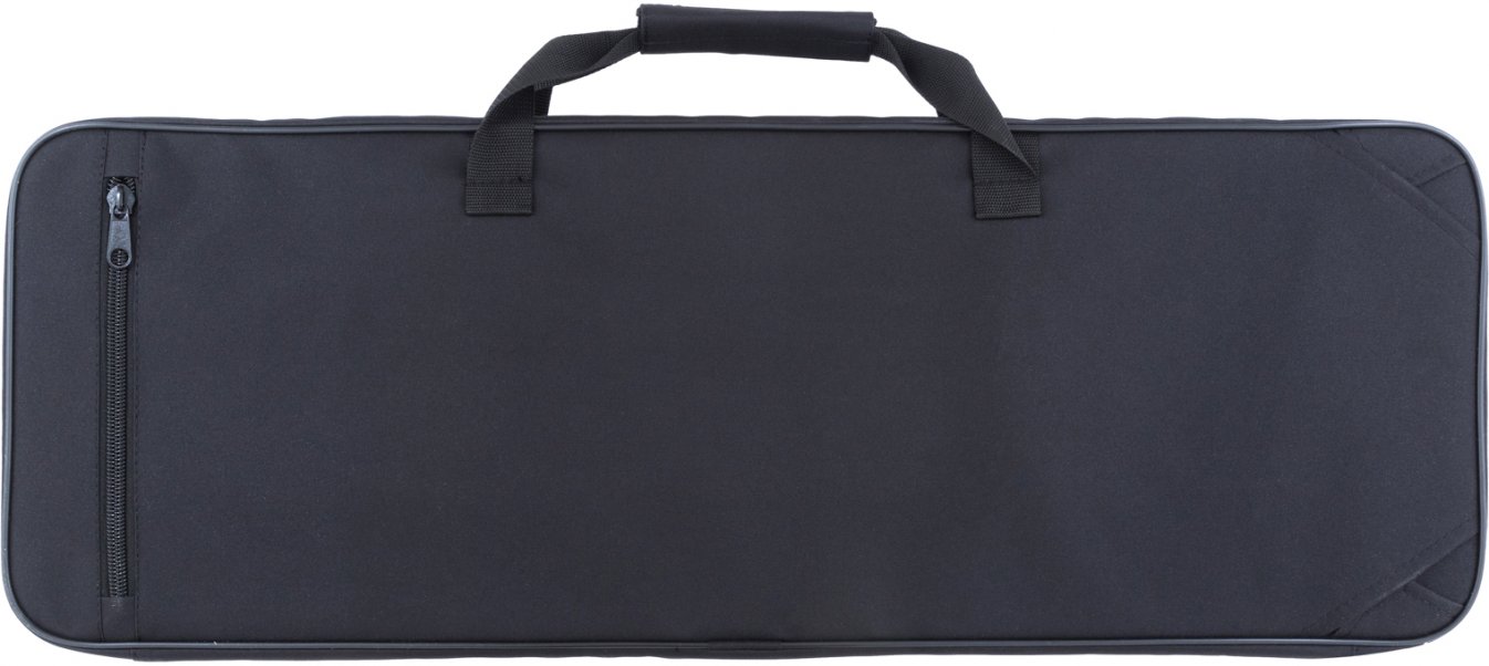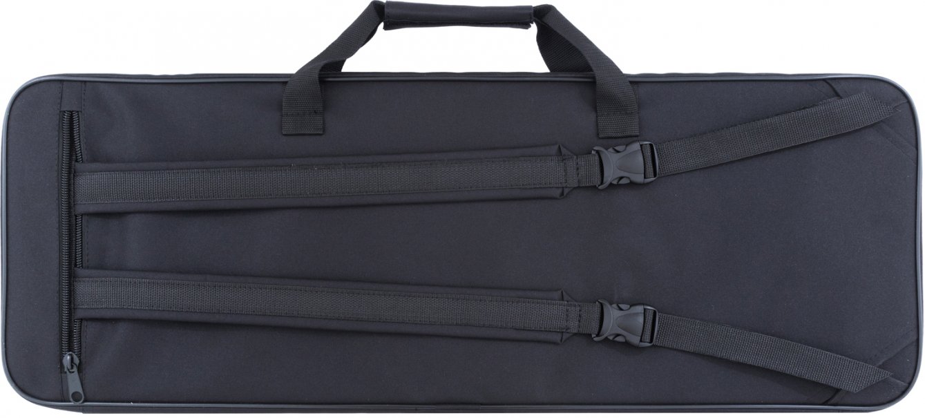 Крупная двух-замковая молния, ручка для переноски чехла в горизонтальном положении, рюкзачные лямки, спрятанные на спинке чехла.